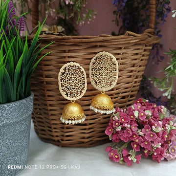 THE RAJDARBAR LOOK TOP WITH HANDMADE AND TEXTURED JHUMKI WITH ARTIFICIAL PEARL PUWAEE WORK IN MATT FINISH